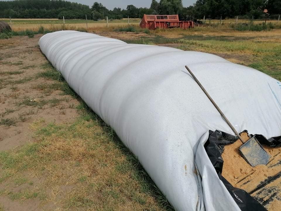 Külső oldalán fehér, belső oldalán fekete, UV stabilizált, nem fényáteresztő, háromrétegű silótömlő, töltésre kész állapotra hajtogatva.
